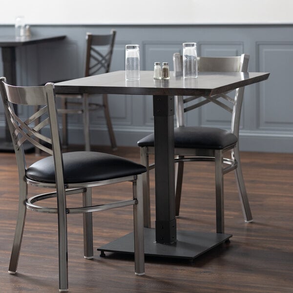 This table base combines the natural look of wood with rugged metal accents to add a rustic element with contemporary flair to your establishment. The perfect piece for your winery, brewery, or farm-to-table eatery, this table base elevates compatible table tops to a comfortable height, ensuring tables stay steady and balanced while guests enjoy your signature drinks and dishes.