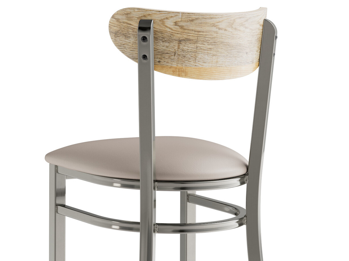 This bar stool's wooden Boomerang back and padded seat combine with its modern steel frame to instill a unique look in any location. Plus, since this bar stool's back is contoured for a customer's back, it will provide comfort while maintaining a distinct appearance.