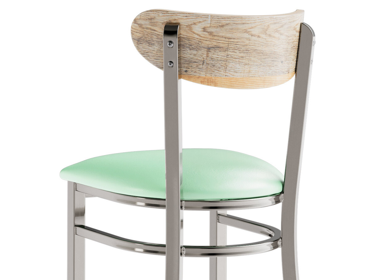 This bar stool's wooden Boomerang back and padded seat combine with its modern steel frame to instill a unique look in any location. Plus, since this bar stool's back is contoured for a customer's back, it will provide comfort while maintaining a distinct appearance.