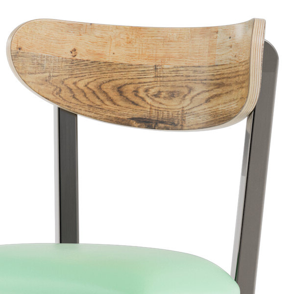 Seat your guests in comfort and style with this Lancaster Table & Seating Boomerang clear coat finish bar stool with 2 1/2" seafoam vinyl padded seat and driftwood back.