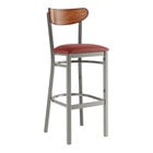 Seat your guests in comfort and style with this Lancaster Table & Seating Boomerang clear coat finish bar stool with 2 1/2" dark gray vinyl padded seat and antique walnut wood back.