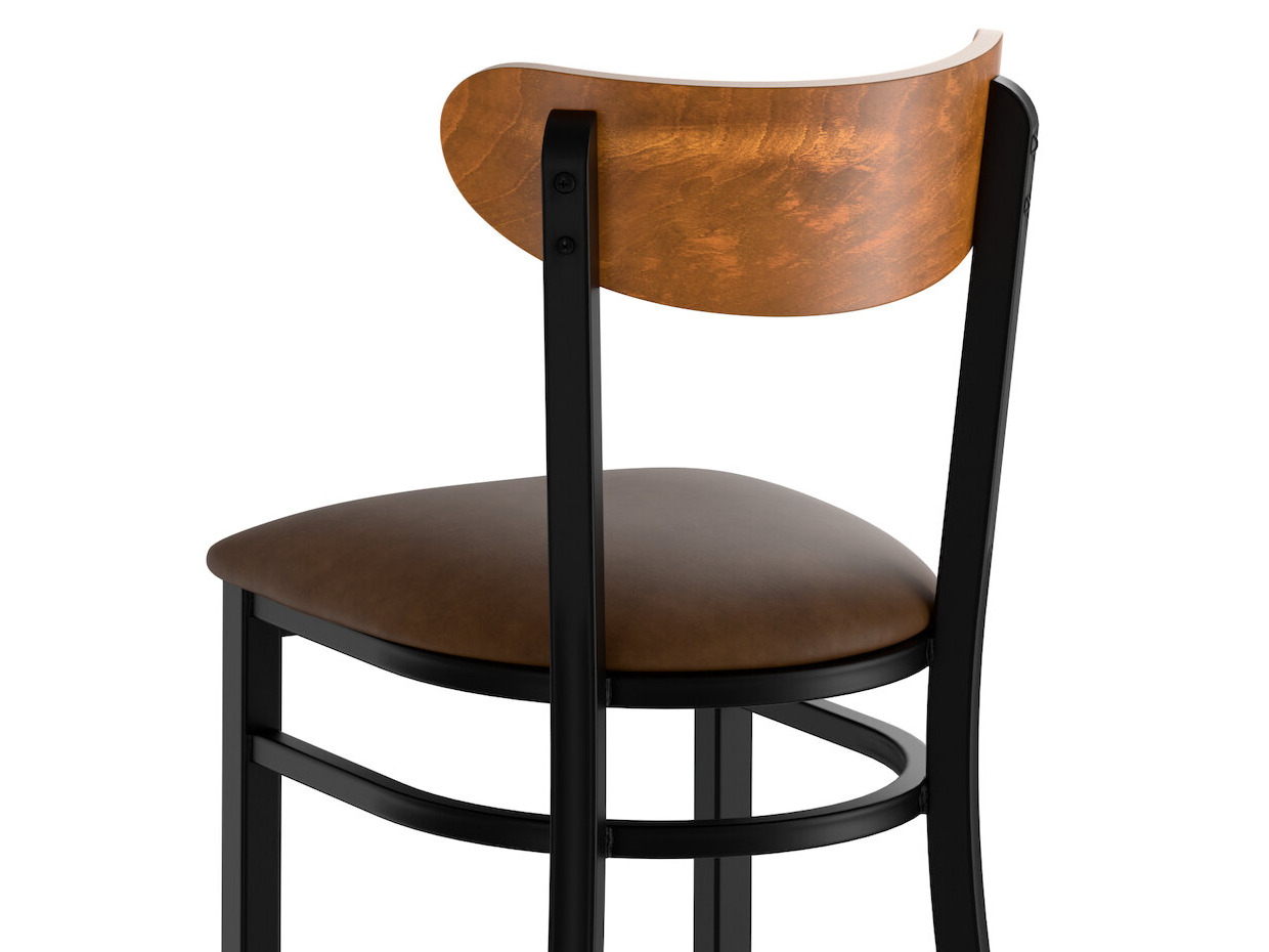 Seat your guests in comfort and style with this Lancaster Table & Seating Boomerang black finish bar stool with 2 1/2" dark brown vinyl padded seat and vintage wood back.