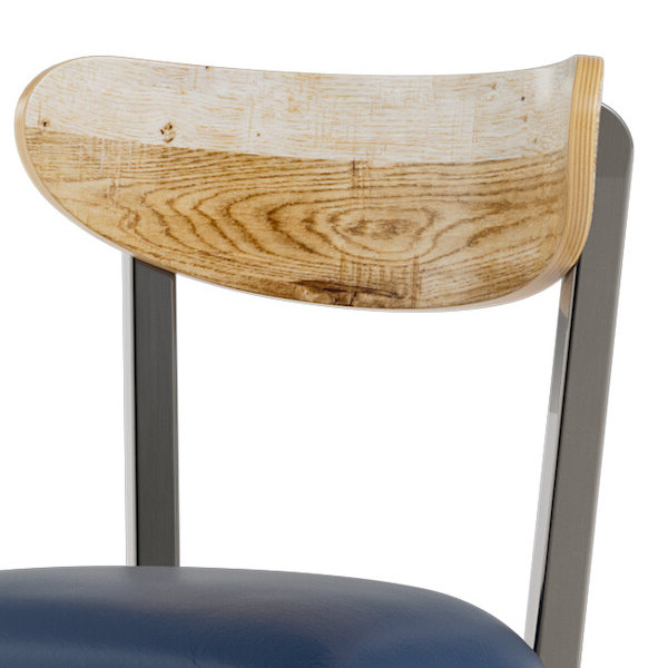 Seat your guests in comfort and style with this Lancaster Table & Seating Boomerang clear coat finish bar stool with 2 1/2" navy vinyl padded seat and driftwood back.