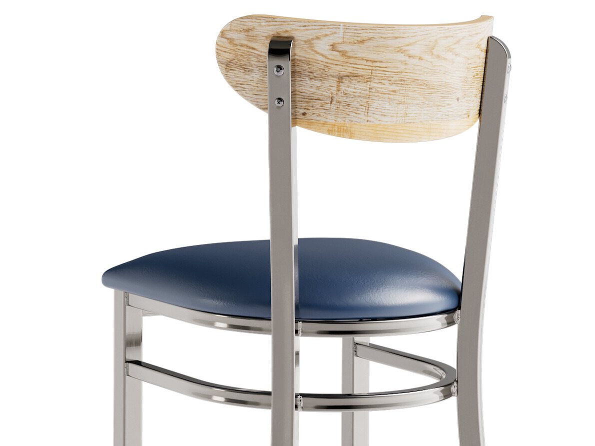 This bar stool's wooden Boomerang back and padded seat combine with its modern steel frame to instill a unique look in any location. Plus, since this bar stool's back is contoured for a customer's back, it will provide comfort while maintaining a distinct appearance.