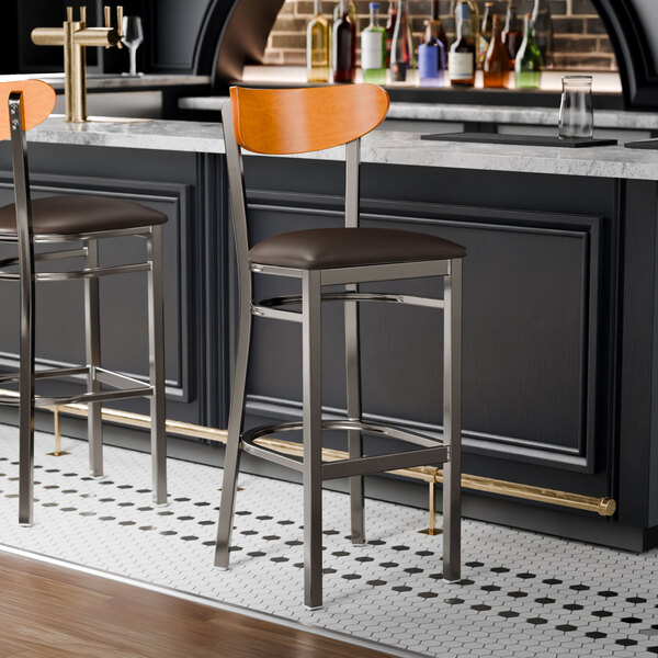 Seat your guests in comfort and style with this Lancaster Table & Seating Boomerang clear coat finish bar stool with 2 1/2" dark brown vinyl padded seat and cherry wood back.
