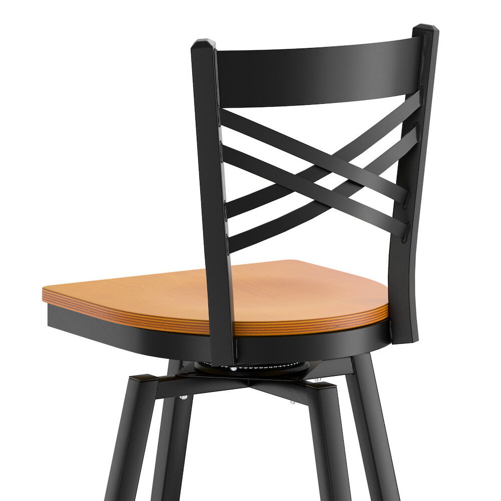 Seat your guests in comfort and style with this Lancaster Table & Seating black finish cross back swivel bar stool with cherry wood seat.