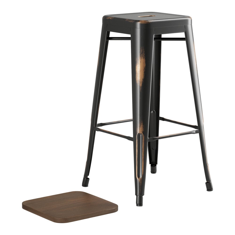 Take your modern restaurant, cafe, or bistro to the next level with this Lancaster Table & Seating Alloy distressed copper indoor backless barstool with walnut wood seat!
