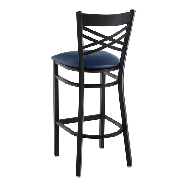 Seat your guests in comfort and style with this Lancaster Table & Seating black finish cross back bar stool with 2 1/2" navy vinyl padded seat.