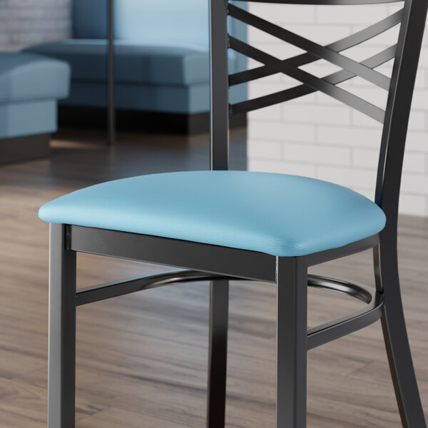 This bar stool's sleek padded seat combines with its contemporary cross back steel frame to instill a modern look in any location. Plus, since this bar stool's back is contoured, it will provide comfort for the customer while maintaining a distinct appearance.