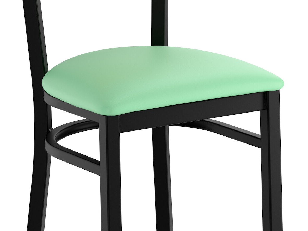 Seat your guests in comfort and style with this Lancaster Table & Seating Boomerang black finish chair with 2 1/2" seafoam vinyl padded seat and cherry wood back.