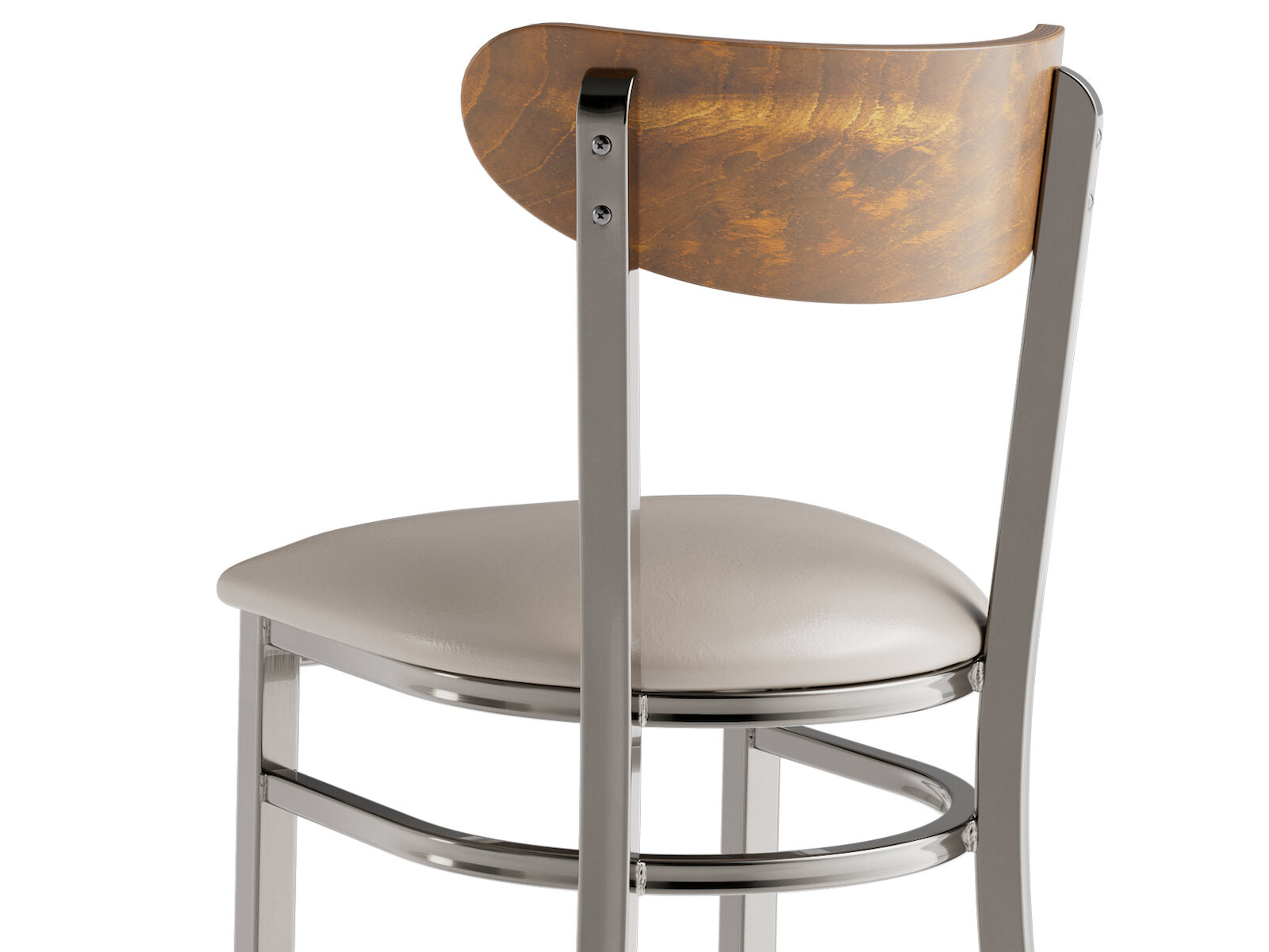 This chair's wooden Boomerang back and padded seat combine with its modern steel frame to instill a unique look in any location. Plus, since this chair's back is contoured for a customer's back, it will provide comfort while maintaining a distinct appearance.