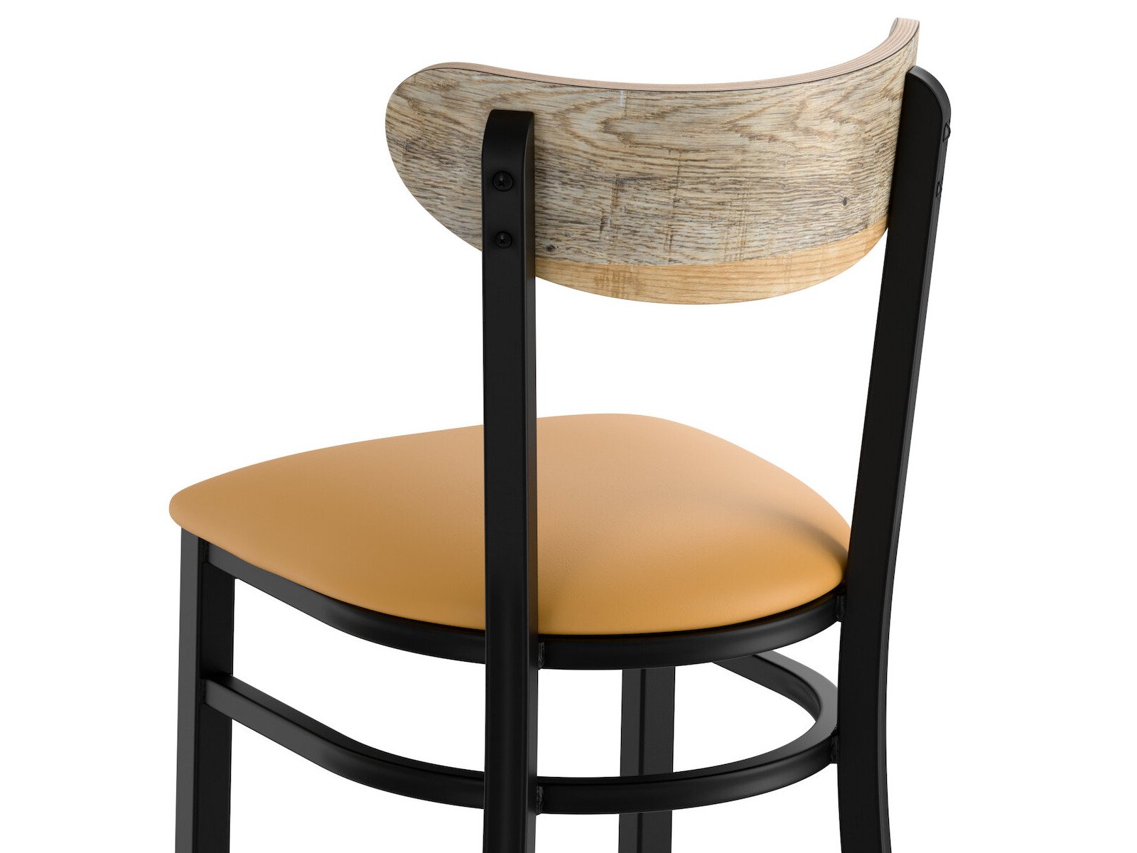 Seat your guests in comfort and style with this Lancaster Table & Seating Boomerang black finish chair with 2 1/2" light brown vinyl padded seat and driftwood back.