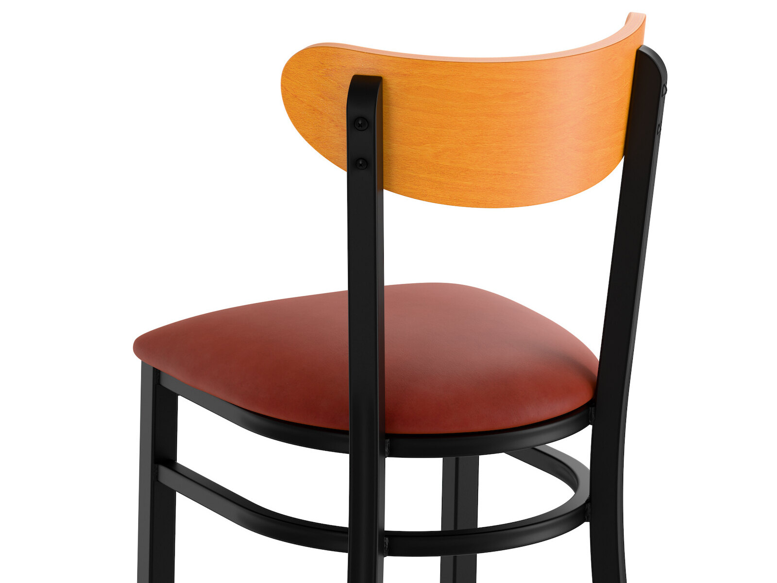 This chair's wooden Boomerang back and padded seat combine with its modern steel frame to instill a unique look in any location. Plus, since this chair's back is contoured for a customer's back, it will provide comfort while maintaining a distinct appearance.