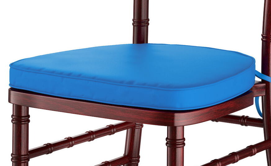 This chair comes complete with a 1 3/4" thick polyurethane sponge padded cushion to ensure that guests are seated comfortably at any event. This cushion has straps to hold it in place on the chair, and a zippered back allows the padding to be removed for laundering.