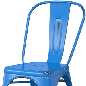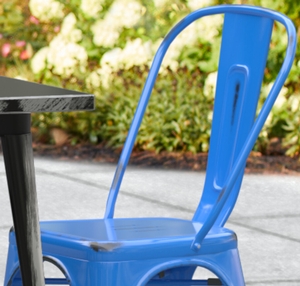This chair is made of durable steel and double coated to withstand years of use. The distressed blue color adds a sleek, modern touch to any setting and is sure to be a contemporary design choice that guests love. Comfortable and stylish, this strong yet lightweight chair is an excellent choice for your indoor or outdoor dining area. To save time and hassle, this chair ships fully assembled.