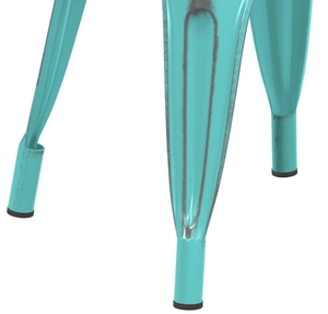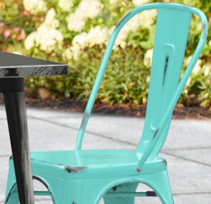 This chair is made of durable steel and double coated to withstand years of use. The distressed seafoam color adds a sleek, modern touch to any setting and is sure to be a contemporary design choice that guests love. Comfortable and stylish, this strong yet lightweight chair is an excellent choice for your indoor or outdoor dining area. To save time and hassle, this chair ships fully assembled.
