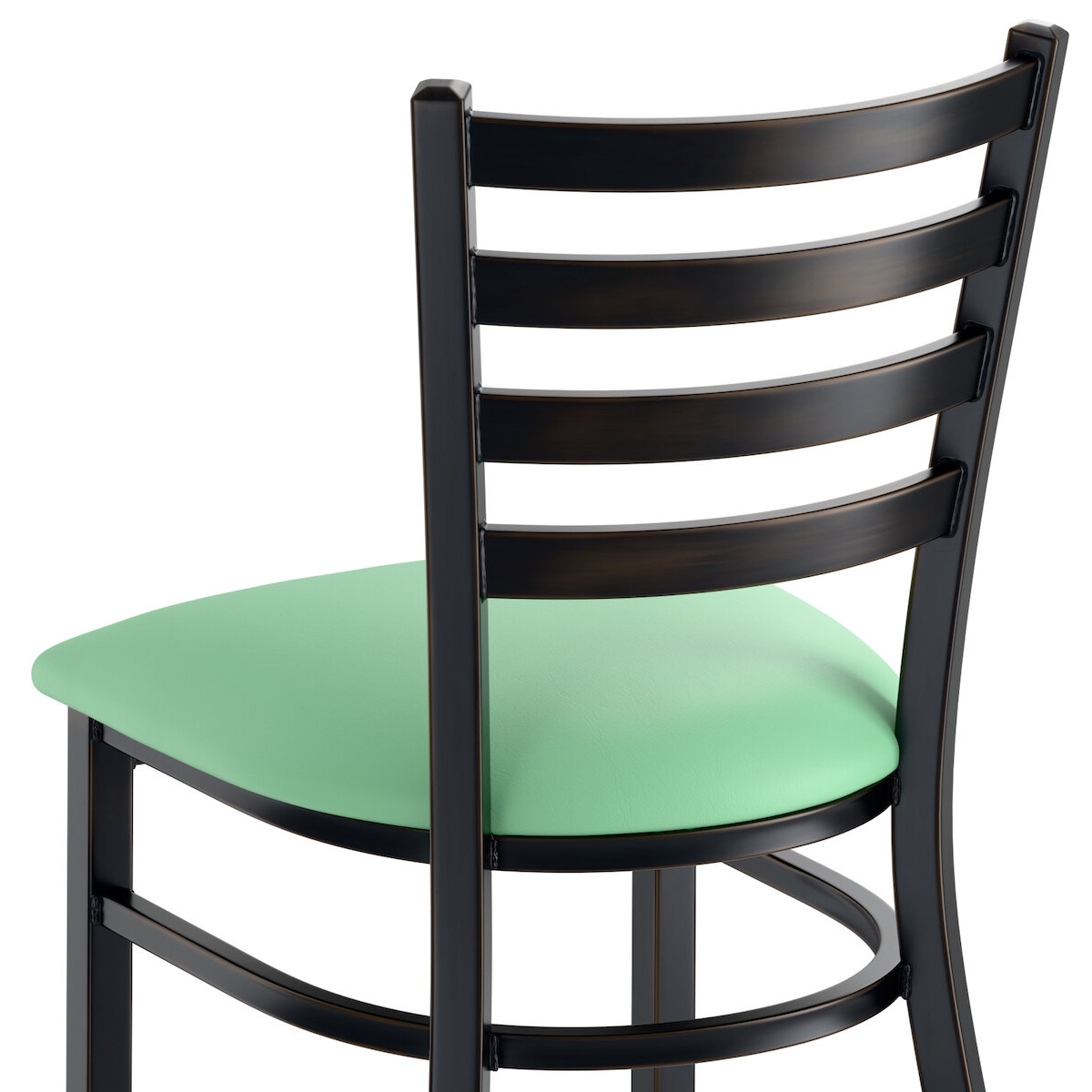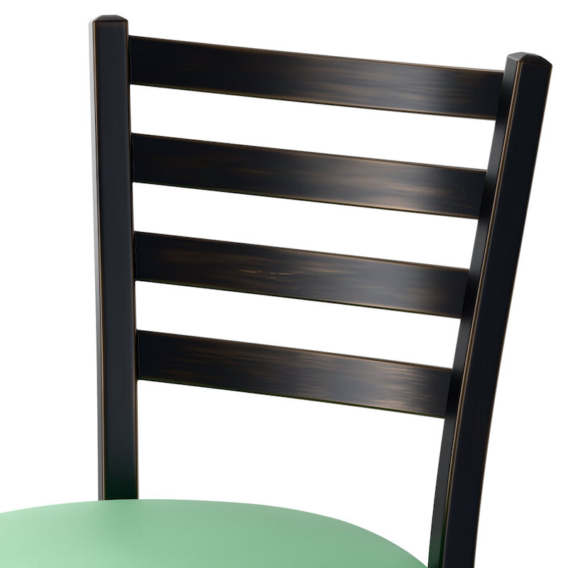 Seat your guests in comfort and style with this Lancaster Table & Seating distressed copper finish ladder back chair with 2 1/2" seafoam vinyl padded seat.
