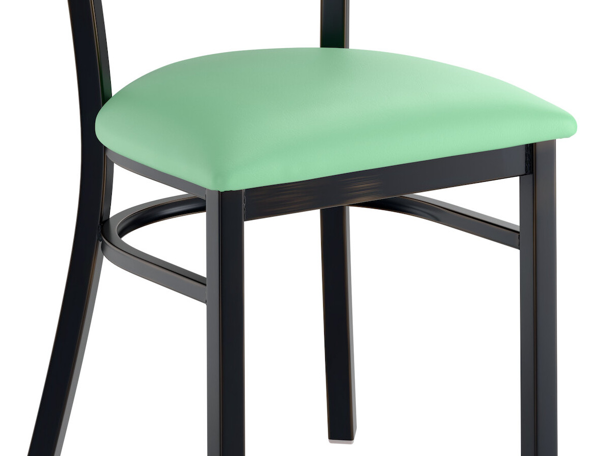 The 2 1/2" thick seafoam vinyl padded seat provides exceptional comfort for your guests, and it's also durable and easy to clean! It is made with fire-retardant foam for added safety.