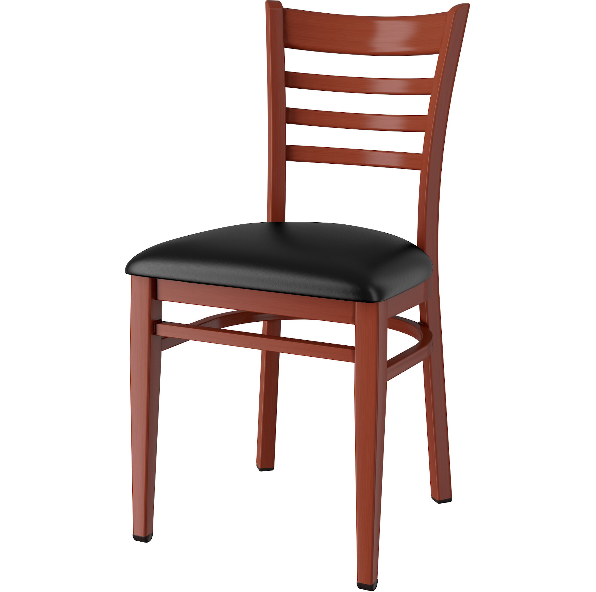 Seat your guests in comfort and style with this Lancaster Table & Seating Spartan metal ladder back chair with mahogany wood grain finish and 2 1/2" black vinyl padded seat.