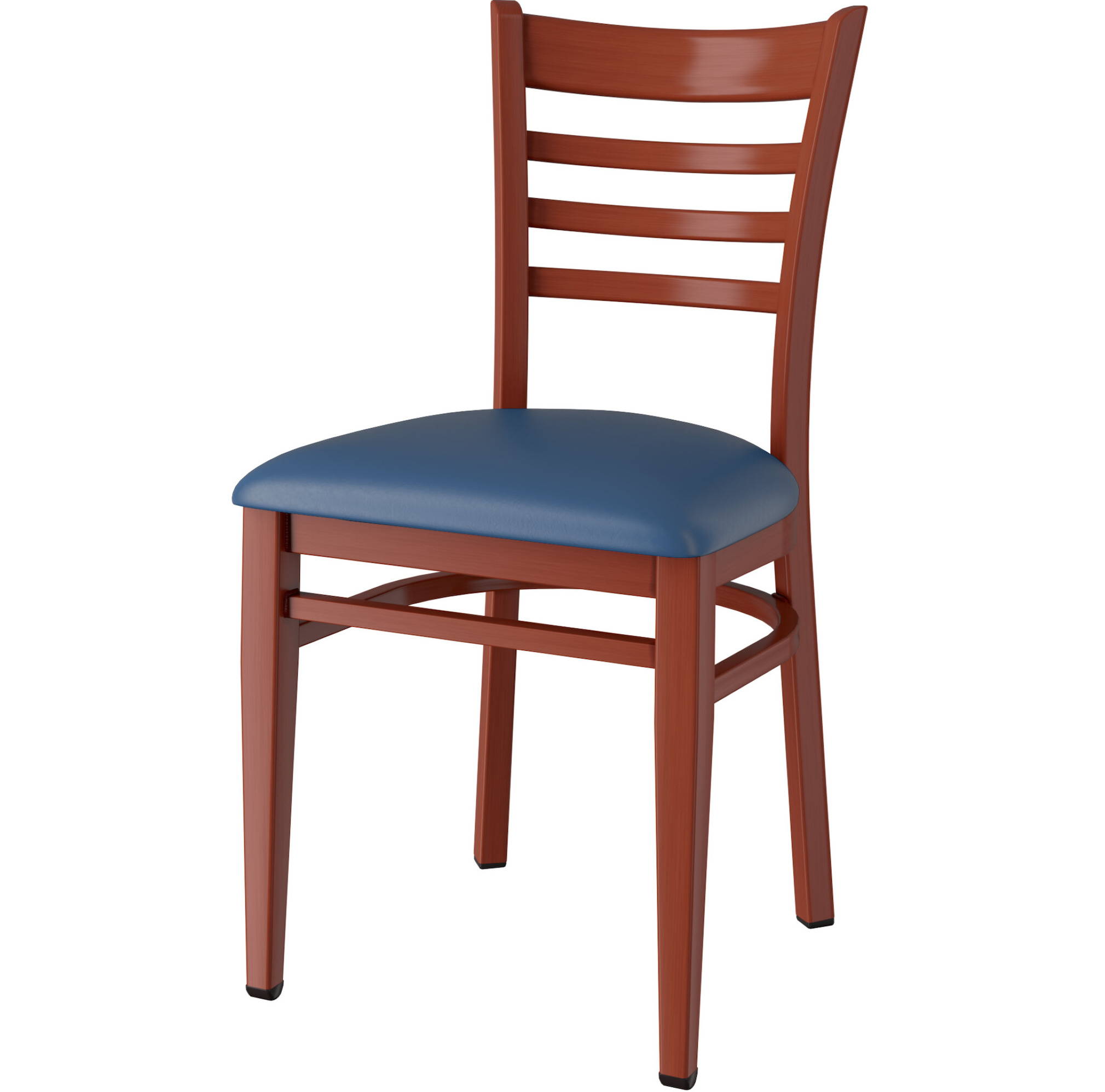 Seat your guests in comfort and style with this Lancaster Table & Seating Spartan metal ladder back chair with mahogany wood grain finish and 2 1/2" navy vinyl padded seat.