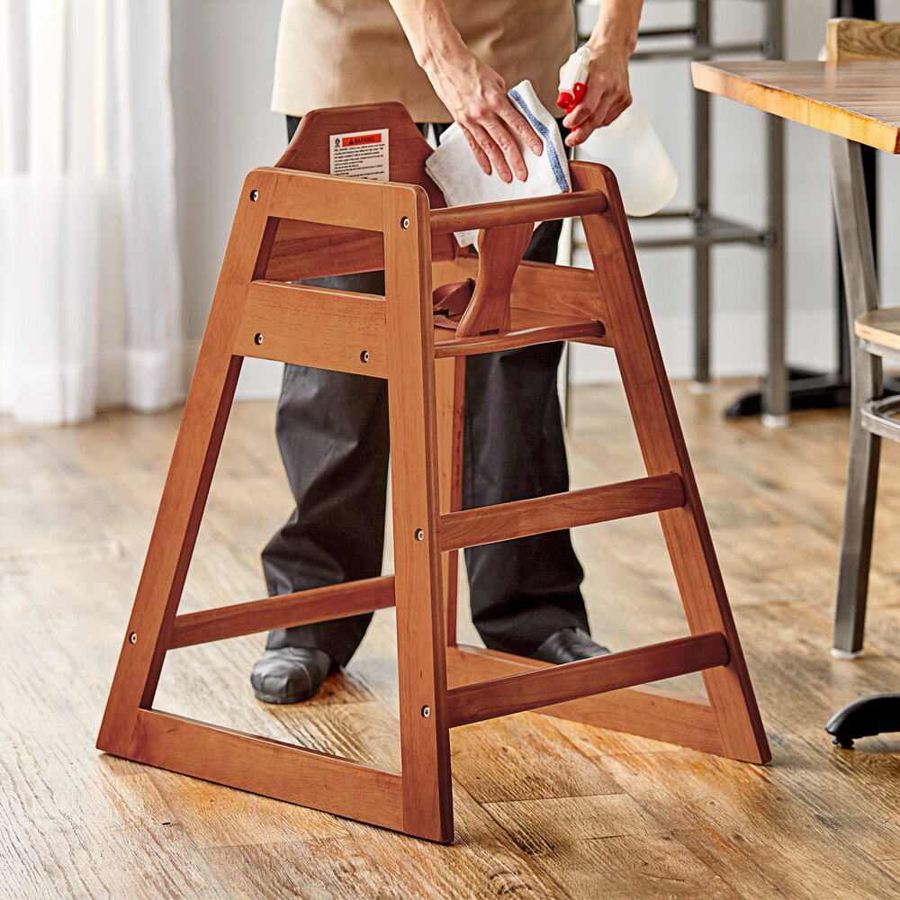 The classic walnut color of this chair adds a nice visual appeal to your dining set up and complements virtually any dining decor. Add this high chair to your restaurant to accommodate your youngest guests in safety and style.