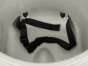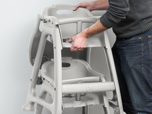 The tray can be quickly removed from the chair by using the clips underneath. The rest of the chair can be wiped down with a damp cloth.