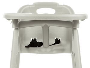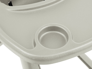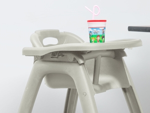 This chair features its own tray with a cup holder, so children can have their meal placed directly in front of them so they don't have to reach onto the dining table. This makes this high chair an ideal choice for multiple dining environments. The tray also snaps on and off for quick cleaning, and removal of the tray allows the high chair to stack with others for space saving storage.