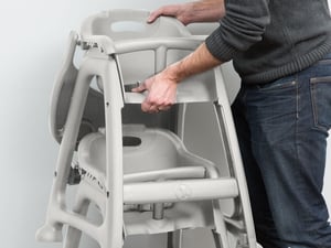 The tray can be quickly removed from the chair by using the clips underneath. The rest of the chair can be wiped down with a damp cloth.
