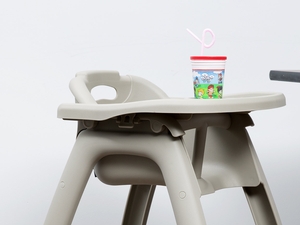 This chair features its own tray with a cup holder, so children can have their meal placed directly in front of them so they don't have to reach onto the dining table. This makes this high chair an ideal choice for multiple dining environments. The tray also snaps on and off for quick cleaning, and removal of the tray allows the high chair to stack with others for space saving storage.