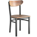 Complementing the rustic table are eight Lancaster Table & Seating Boomerang dining height chairs with vintage wood seats and backs. Each chair has a contemporary black steel frame along with a comfortable vintage wood seat and back. The Boomerang design is both sturdy and stylish, instilling a modern look in any location. Plus, since the chairs' backs are contoured for a customer's back, they will provide unmatched comfort while maintaining a distinct appearance. This reliable and modern design ensures you'll be using these dining height chairs in your pub or restaurant for years to come.