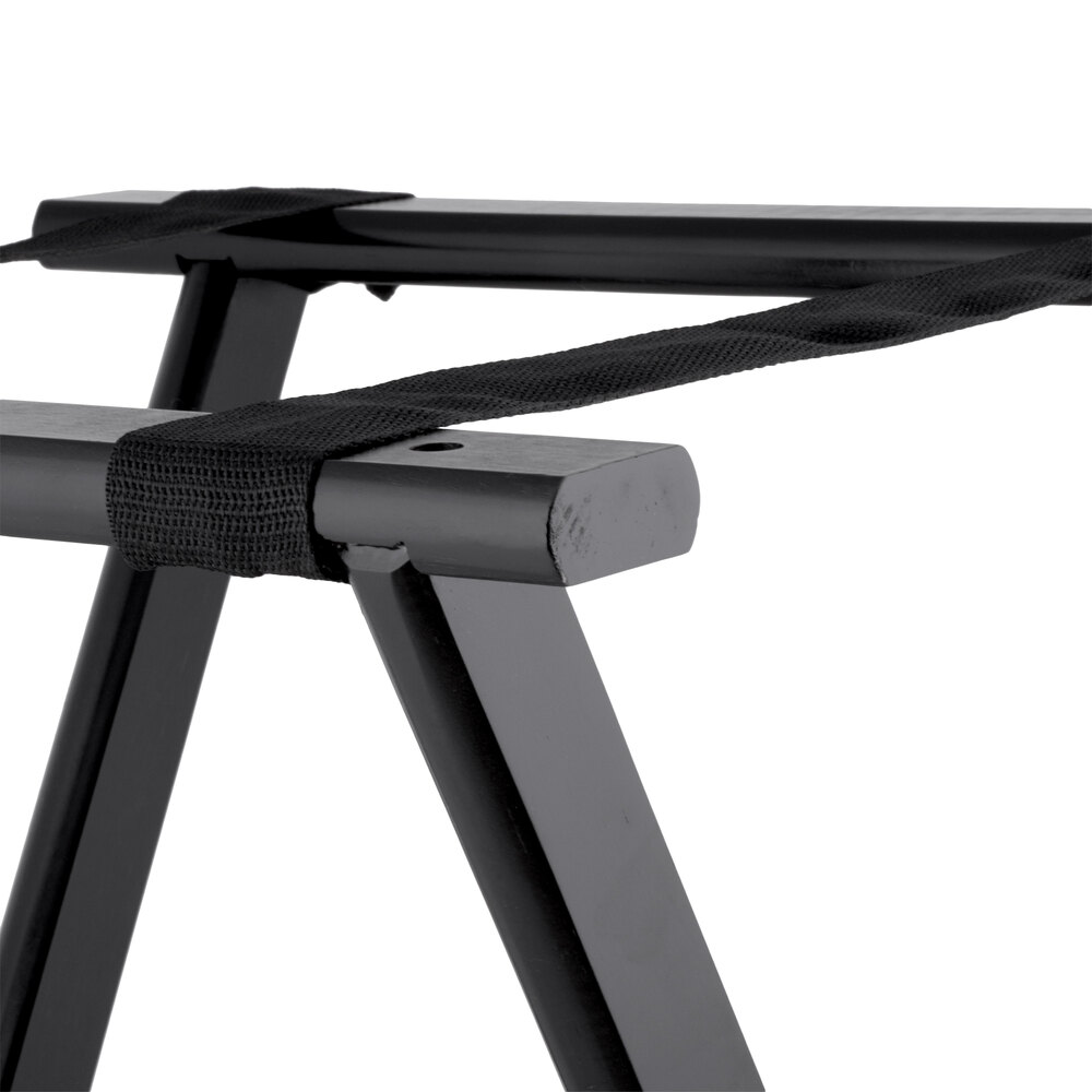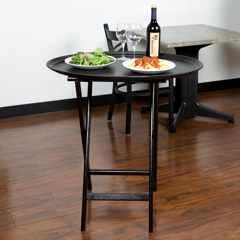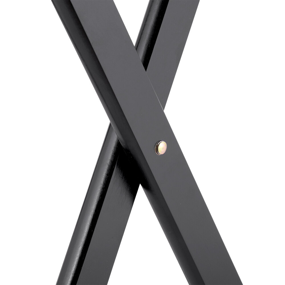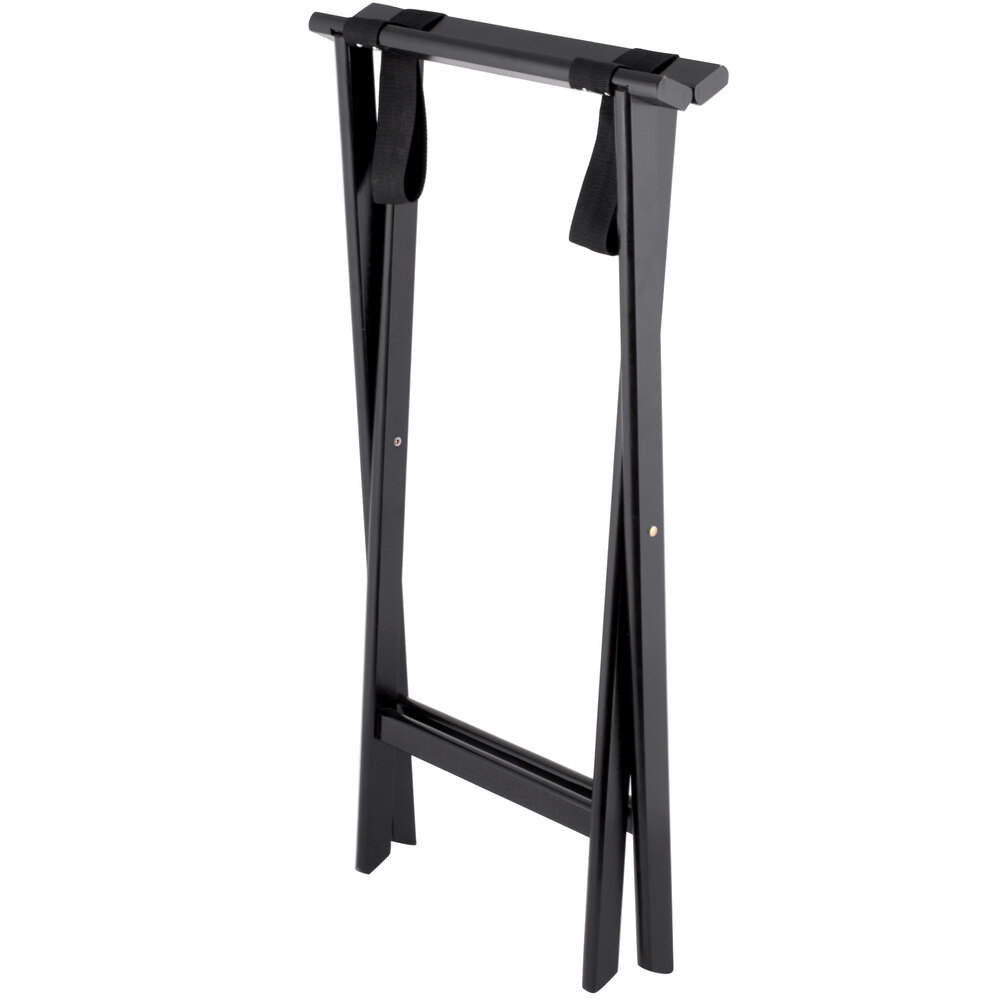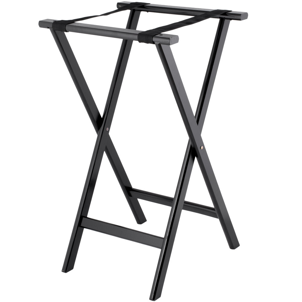 This Lancaster Table & Seating 32" black folding wood tray stand allows servers and food runners to place trays tableside for quick and efficient delivery of hot food. Additionally, its attractive wood construction and sleek black finish make it the perfect complement to any bar, restaurant, pizzeria, bistro, catered event, or hotel. A tray stand is also a great choice for busers who have nowhere to place their bus tub during a busy dinner rush.