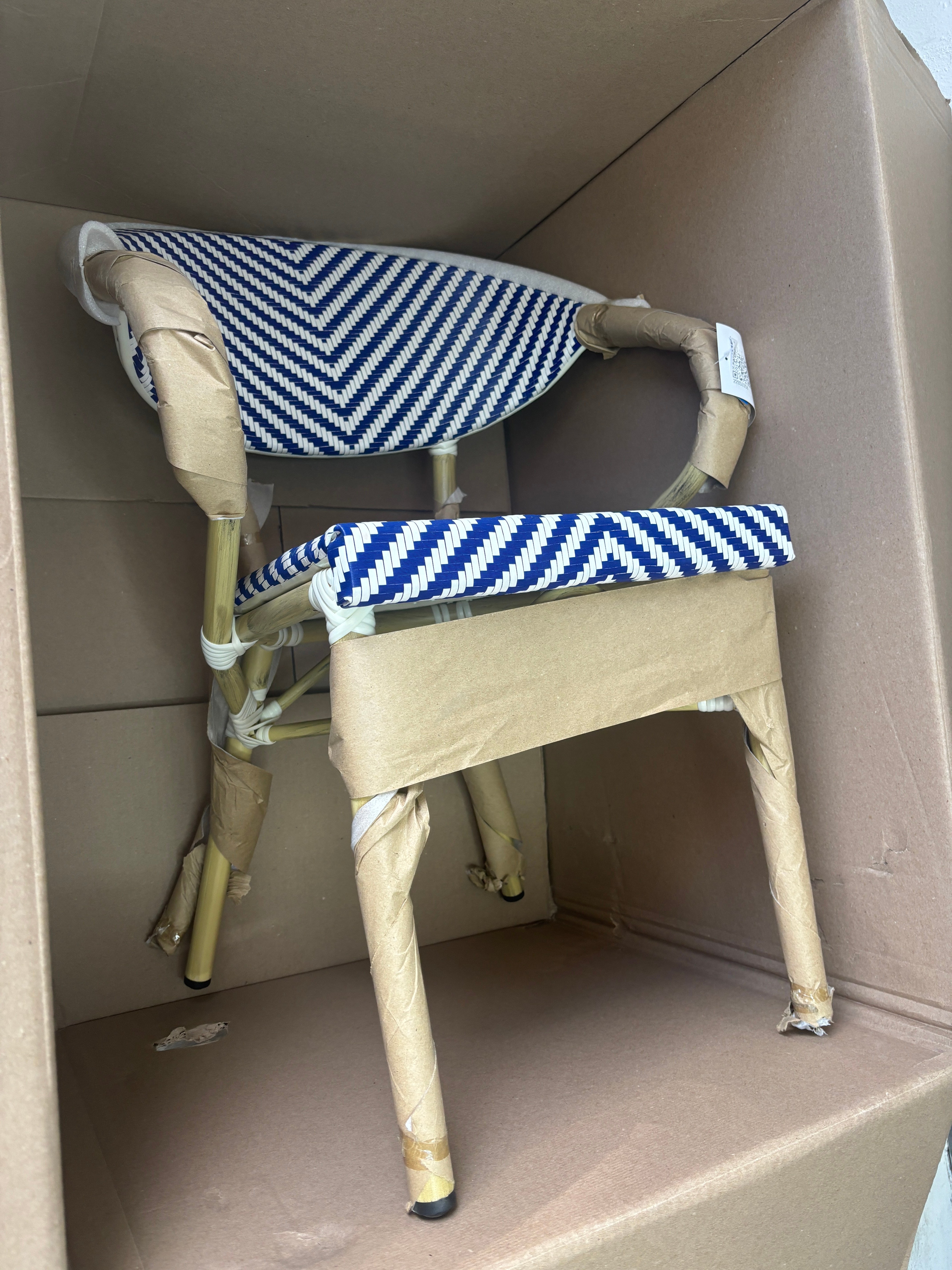 This chair is made of a powder-coated aluminum that is durable enough to resist weather and corrosion while still being lightweight for easy maneuvering. Its smooth surface features the look of bamboo and a modern blue and white, UV-resistant Teslin net woven fabric that is sure to enhance your decor and help keep this outdoor chair looking new. Teslin is a synthetic material made from a blend of PVC and polyester fibers woven together to make a mesh-like fabric that is highly durable and affordable.