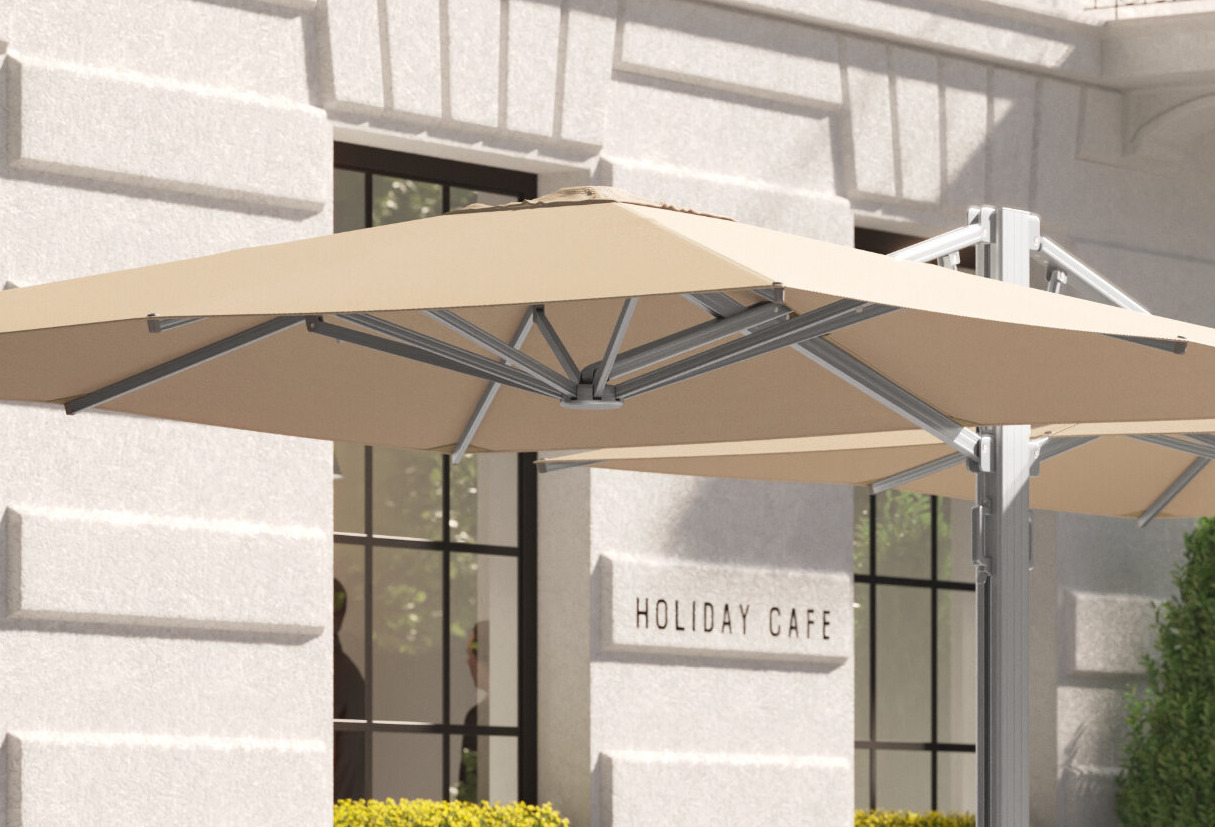 Twin-arm hydraulic lift makes it quick and simple to open and close the umbrella