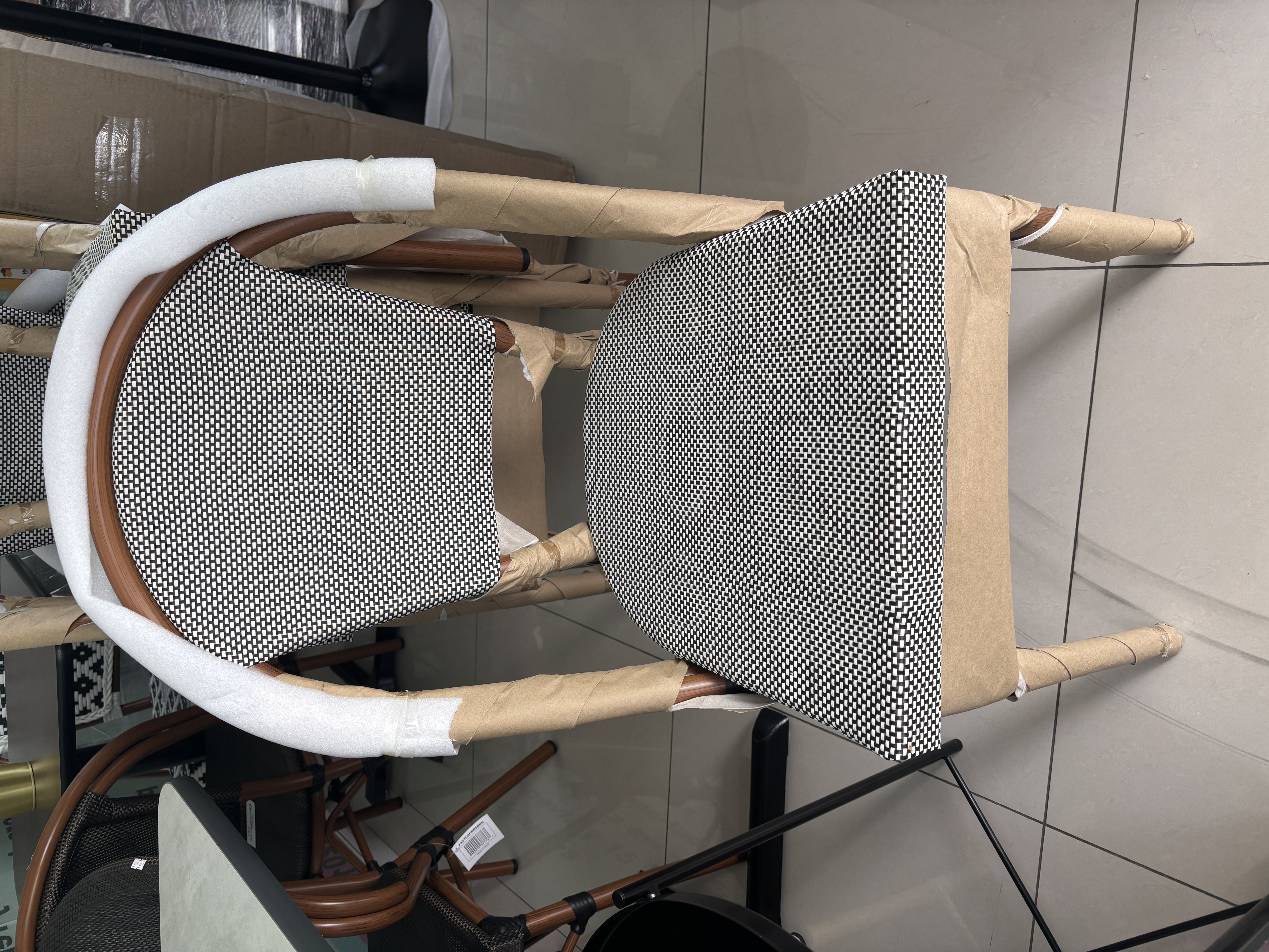 This chair is made of a powder-coated aluminum that is durable enough to resist weather and corrosion while still being lightweight for easy maneuvering. Its smooth surface features the look of bamboo and a modern brown, UV-resistant Teslin net woven fabric that is sure to enhance your decor and help keep this outdoor chair looking new. Teslin is a synthetic material made from a blend of PVC and polyester fibers woven together to make a mesh-like fabric that is highly durable and affordable.