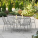 Add functionality and pizzazz to your outdoor dining with the Lancaster Table & Seating Harbor gray 36" square outdoor standard height table with ornate legs and 4 arm chairs!