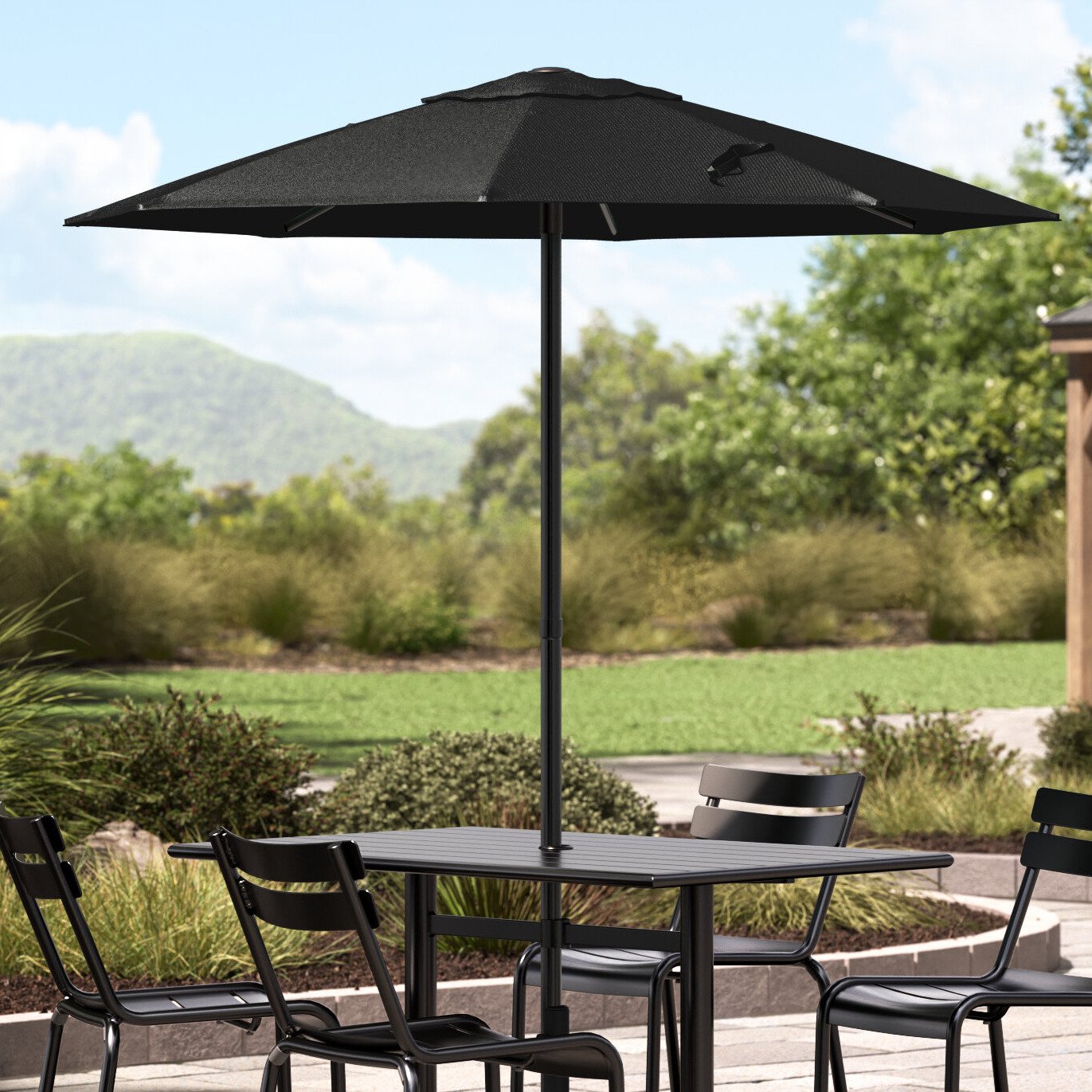 Enjoy the outdoors under the pleasant shade of this Lancaster Table & Seating 6' coal black push lift black steel umbrella!