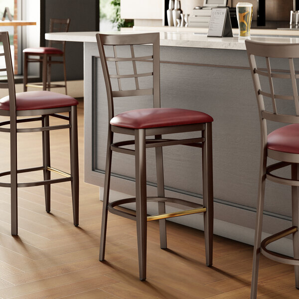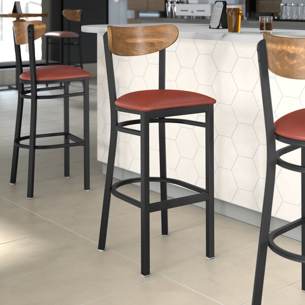 Boomerang Black Finish Bar Stool with Burgundy Vinyl Seat and Back