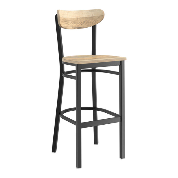 Boomerang Black Finish Bar Stool with Vintage Wood Seat and Back