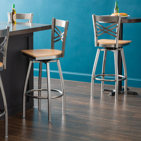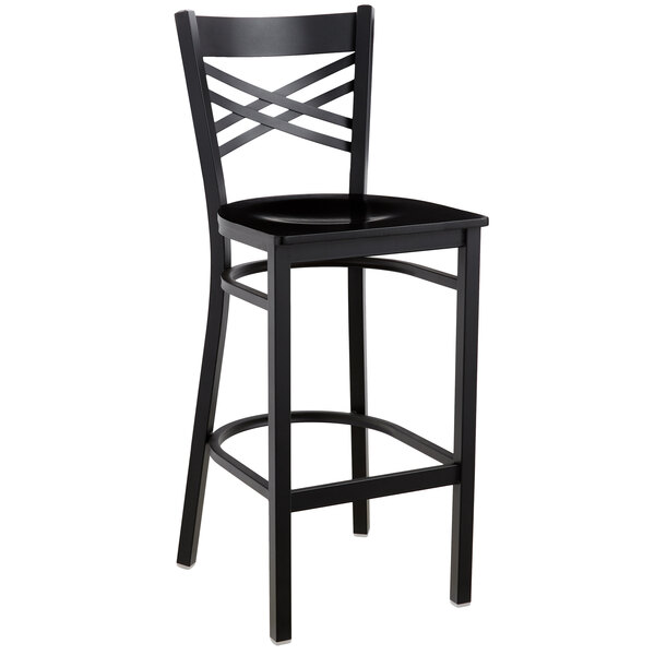 Clear Coat Finish Cross Back Bar Stool with Vintage Wood Seat - Assembled