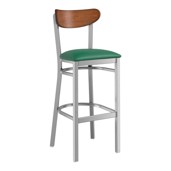 Boomerang Black Finish Bar Stool with Green Vinyl Seat and Antique Waln...