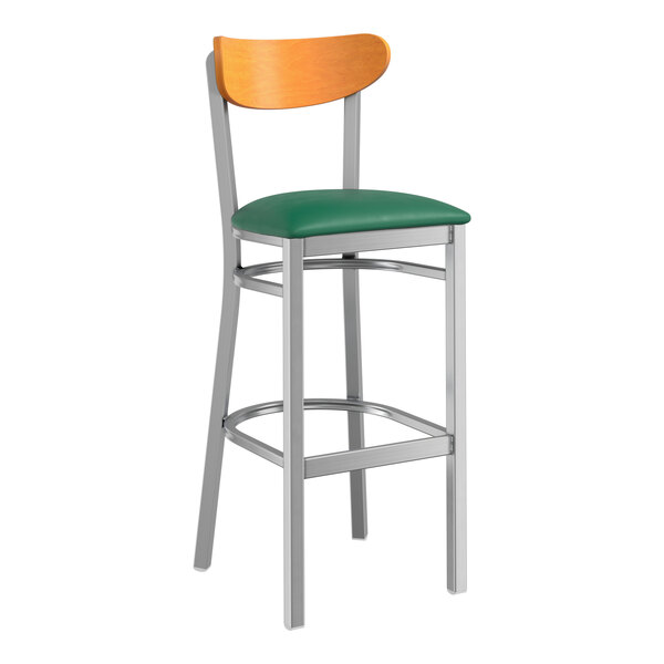 Boomerang Black Finish Bar Stool with Green Vinyl Seat and Cherry Wood ...