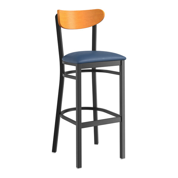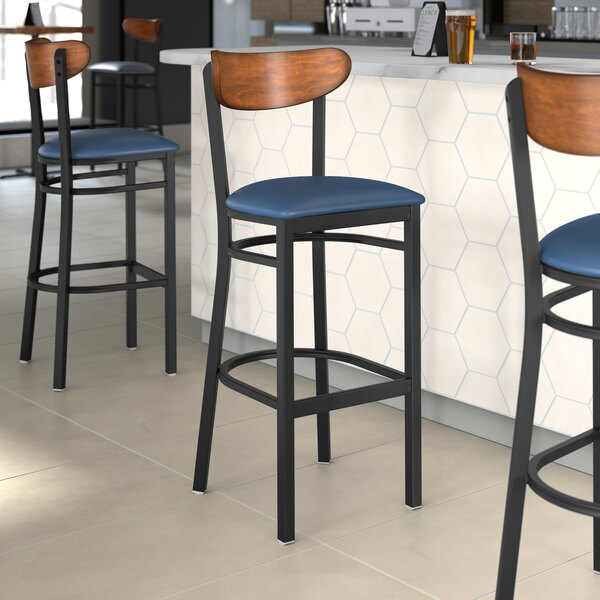 Boomerang Black Finish Bar Stool with Navy Vinyl Seat and Antique Walnu...