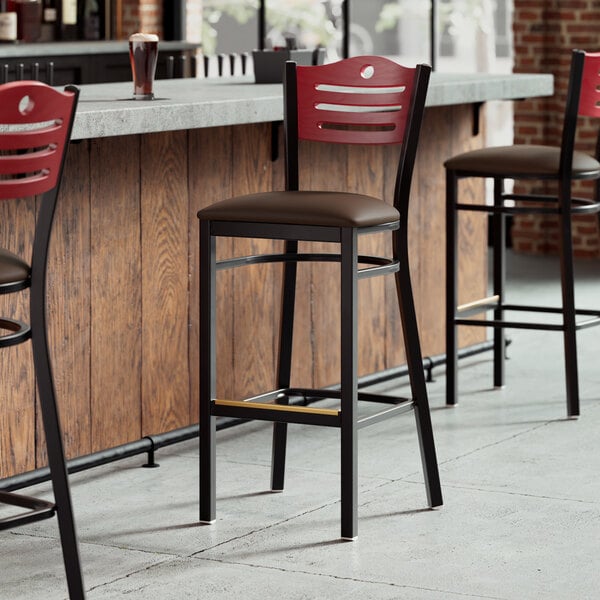 Boomerang Black Finish Bar Stool with Dark Brown Vinyl Seat and Cherry ...