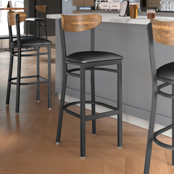 Boomerang Black Finish Bar Stool with Black Vinyl Seat and Antique Waln...
