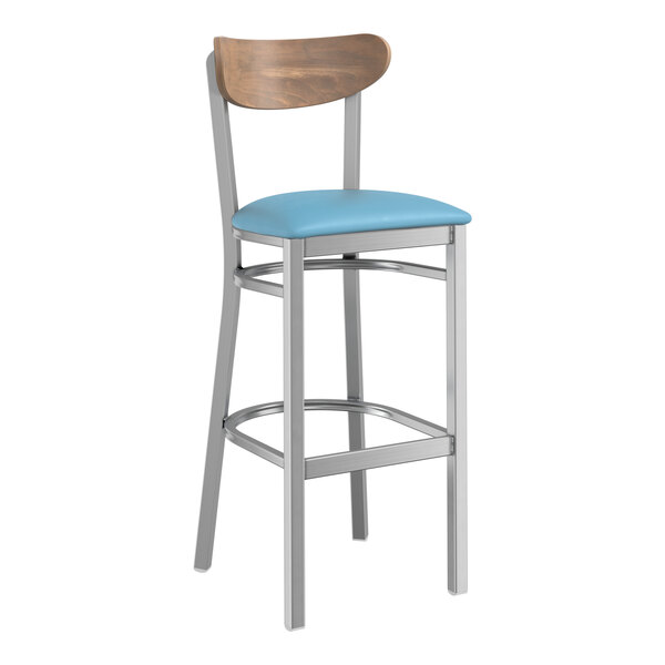 Boomerang Clear Coat Finish Bar Stool with Blue Vinyl Seat and Cherry W...