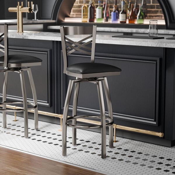 Alloy Nickel Gray Indoor Cafe Barstool with Black Vinyl Cushion