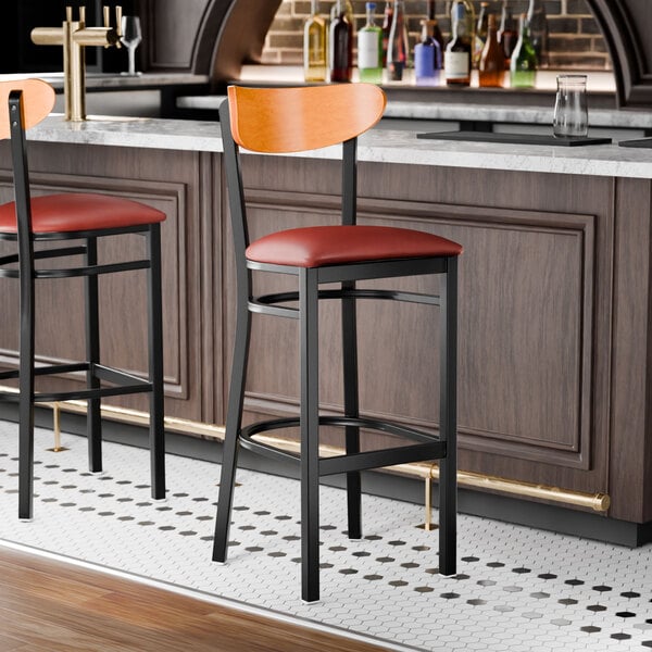 Boomerang Black Finish Bar Stool with Burgundy Vinyl Seat and Cherry Wo...