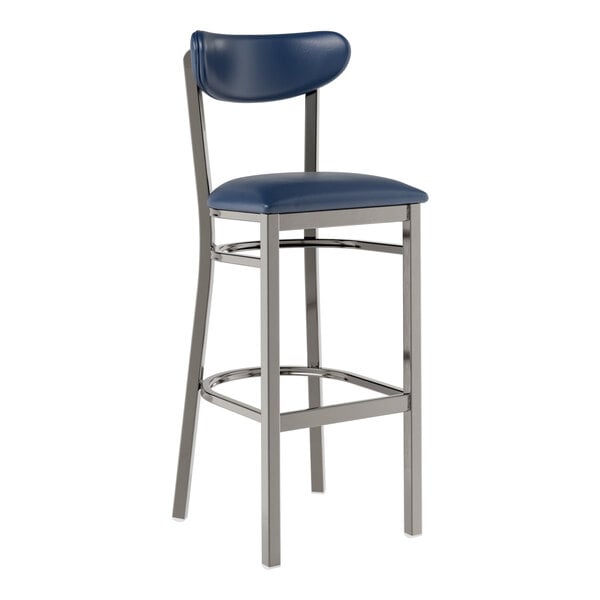 Boomerang Black Finish Bar Stool with Navy Vinyl Seat and Back