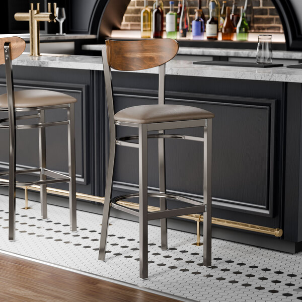 Boomerang Black Finish Bar Stool with Taupe Vinyl Seat and Antique Waln...