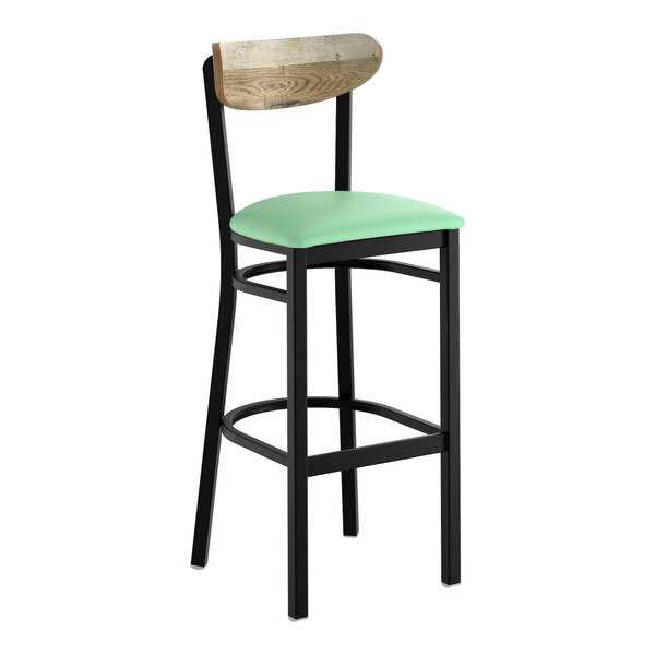 Boomerang Black Finish Bar Stool with Green Vinyl Seat and Vintage Wood...